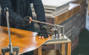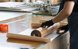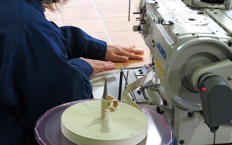 専用カッター及び手作業 にて裁断を行います。裁断後、ミシンにてふちの加工も可能です。